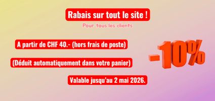 Nous expéditions en Suisse, France, Allemagne, Italie, Espagne, Portugal, Belgique, Norvège, Finlande, Suède et Canada. Pour l'exportation, les frais de livraison dépendent des conditions de la compagnie de transport. Pour la Suisse : - Mode économique : 2-3 jours ouvrables. - Mode prioritaire : 1-2 jours ouvrables. Retrait au magasin, sur rendez-vous : Uniquement pour les produits en stock avec possibilité sur DEMANDE de payer au comptant (cash) ou paiement en ligne.